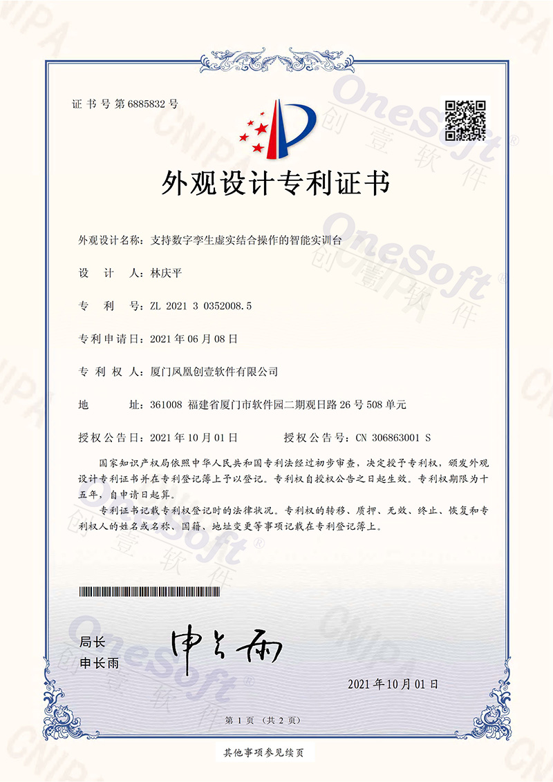 鳳凰創(chuàng)壹智能實(shí)驗(yàn)臺(tái) (外觀設(shè)計(jì)專(zhuān)利證書(shū))