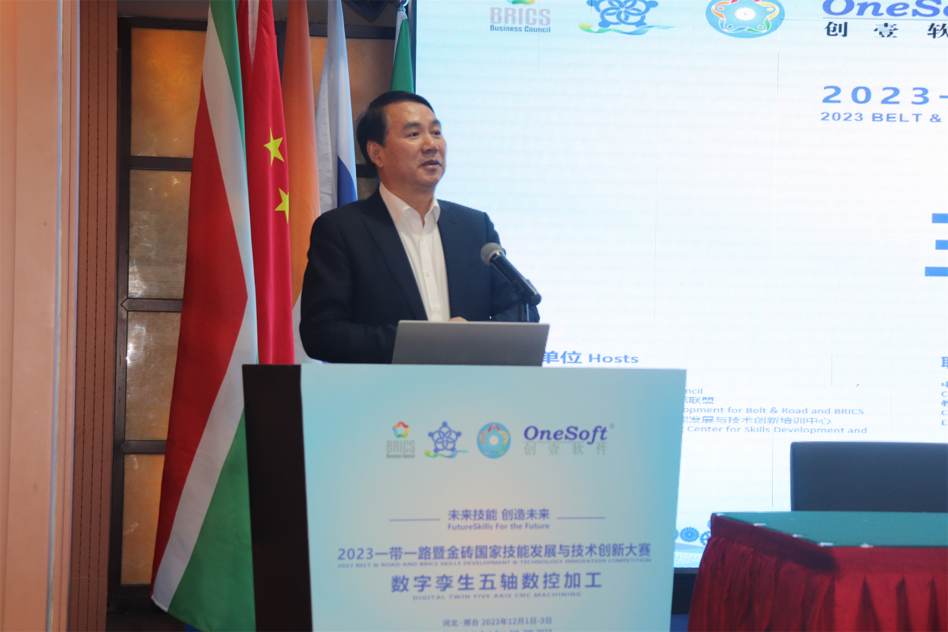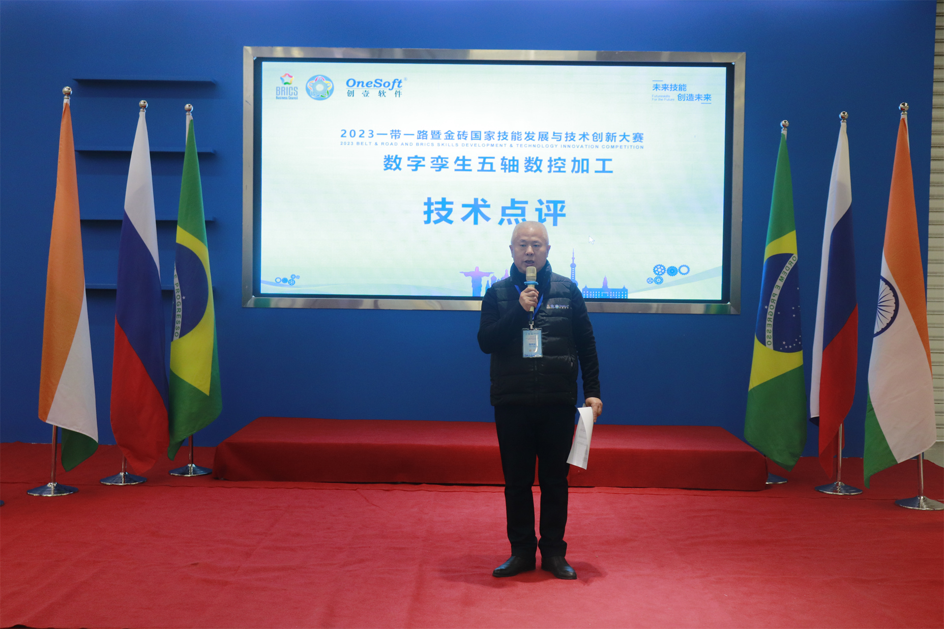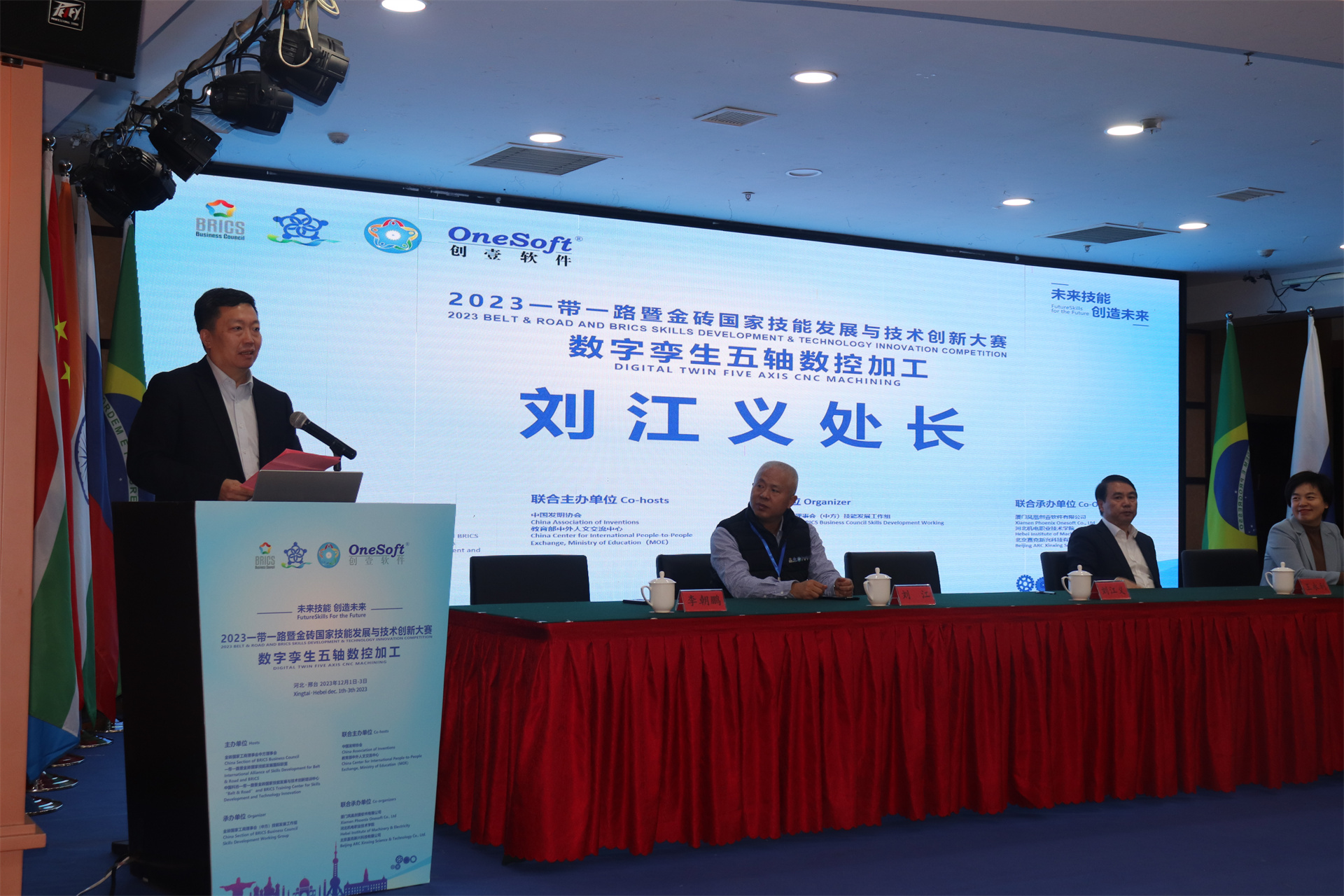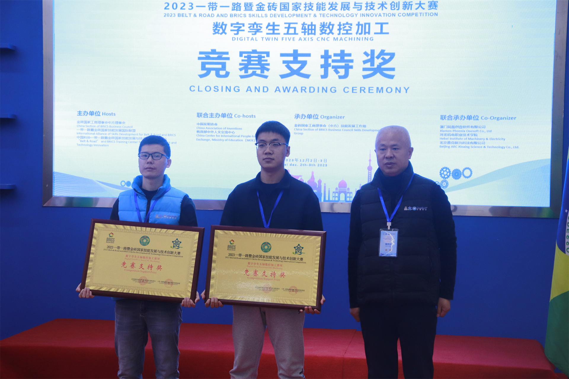 12月1日,2023一帶一路暨金磚國家技能發(fā)展與技術(shù)創(chuàng)新大賽數(shù)字孿生五軸數(shù)控加工賽項國內(nèi)決賽開幕式在萬峰大酒店舉行,由河北機電職業(yè)技術(shù)學(xué)院副院長李朝鵬主持。金磚國家工商理事會(中方)技能發(fā)展工作組組長、金磚國家技能發(fā)展與技術(shù)創(chuàng)新大賽組委會執(zhí)委會主席劉振英視頻致辭,中國教育國際交流協(xié)會副會長,前秘書長王永利、金磚國家技能發(fā)展與技術(shù)創(chuàng)新大賽組委會副主任何美連,河北省教育廳國際處劉江義處長、河北機電職業(yè)技術(shù)學(xué)院院長王曉鳳、廈門鳳凰創(chuàng)壹軟件有限公司運營總監(jiān)陳海寧等領(lǐng)導(dǎo)受邀出席并致辭。河北機電職業(yè)技術(shù)學(xué)院繼續(xù)教育部主任李成革、廈門鳳凰創(chuàng)壹軟件有限公司高級總監(jiān)江蕓梅等領(lǐng)導(dǎo)出席開幕式,仲裁長、總裁判長及裁判組成員、行業(yè)專家、參賽院校領(lǐng)隊、指導(dǎo)老師、參賽選手等近百人參加了開幕式。