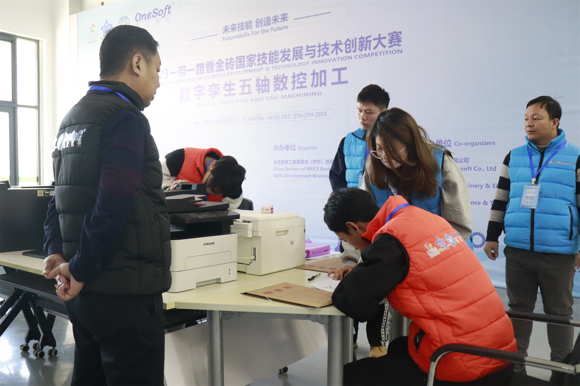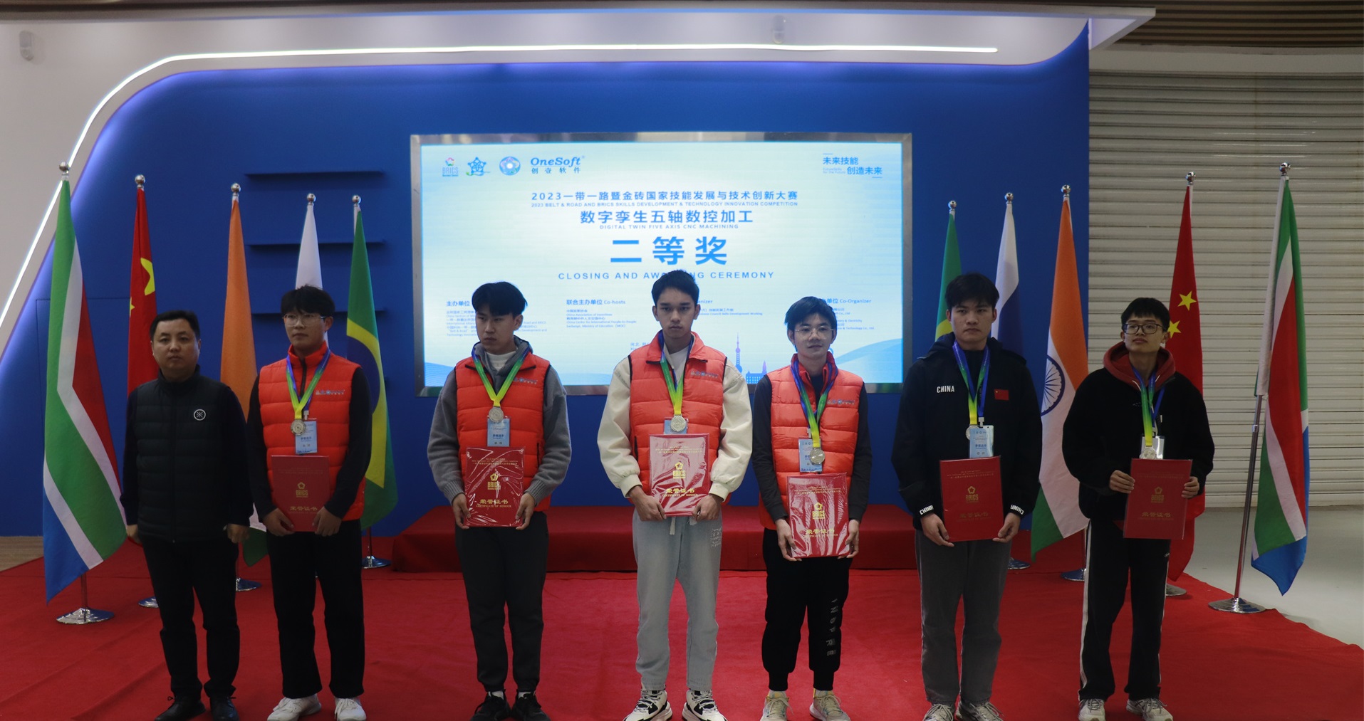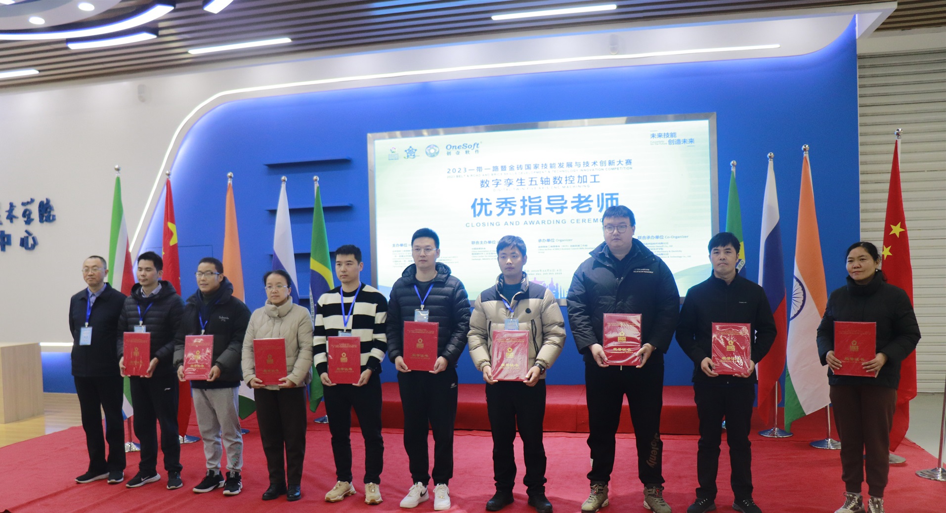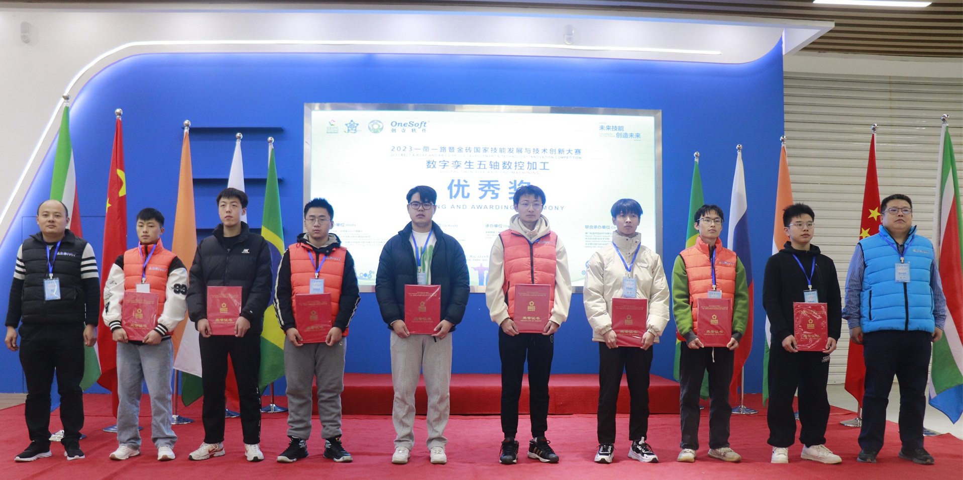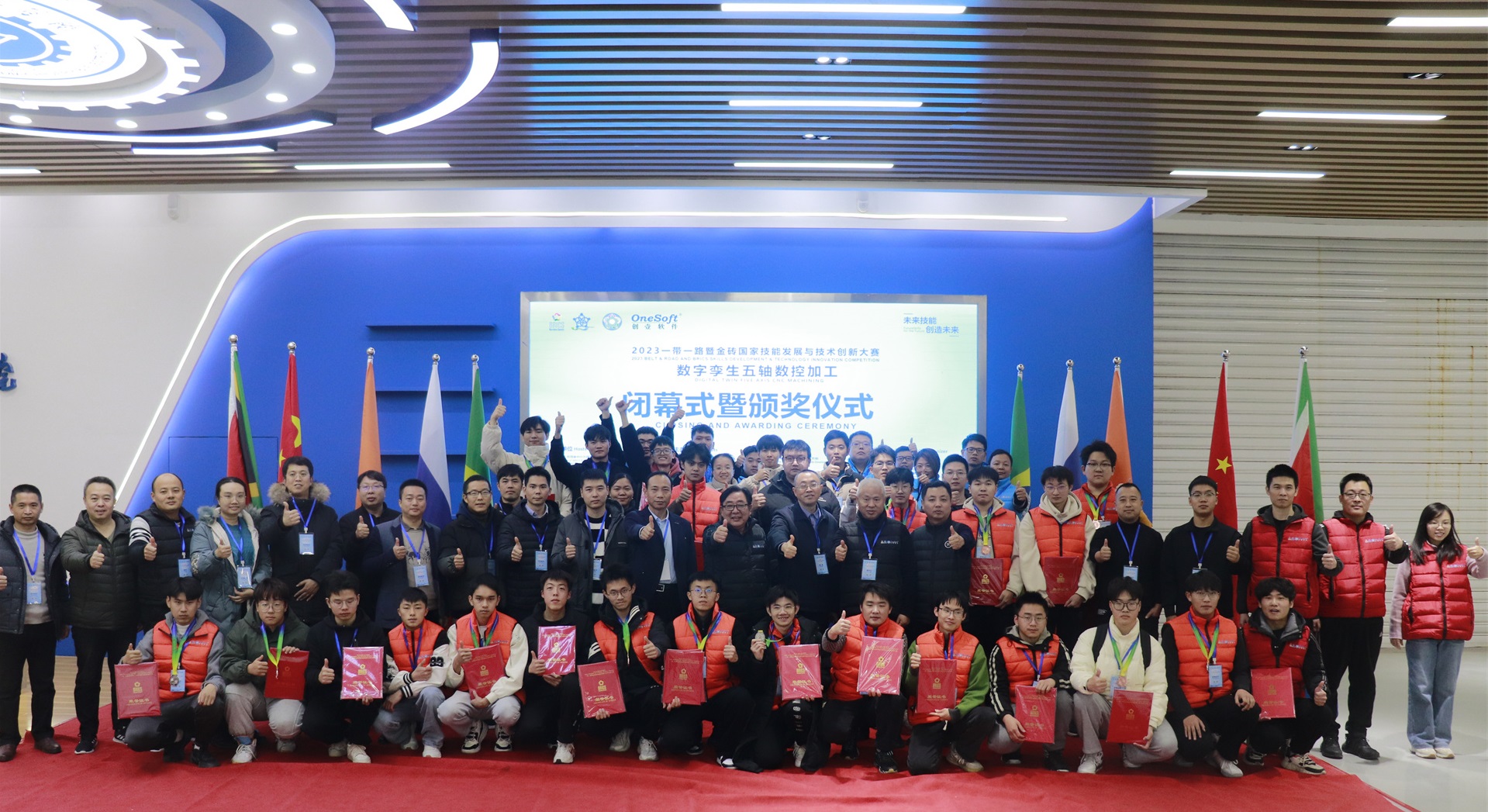 數(shù)字孿生五軸數(shù)控加工賽項于2023年7月開始組織籌備,歷經(jīng)技術(shù)方案評審、選手賽前培訓(xùn)、裁判培訓(xùn),共有來自全國20多個省份49所院校200多名選手報名參加,最終36名選手進(jìn)入全國總決賽。在河北機電職業(yè)技術(shù)學(xué)院展開為期2天的榮耀對決,群英匯聚展現(xiàn)新時代新職業(yè)新工種技能人才風(fēng)采。最終決出一等獎4名、二等獎8名、三等獎11名、優(yōu)秀獎14名,優(yōu)秀指導(dǎo)老師12名,最佳組織獎4個,優(yōu)秀組織獎4個,突出貢獻(xiàn)獎2個,競賽支持獎1個。