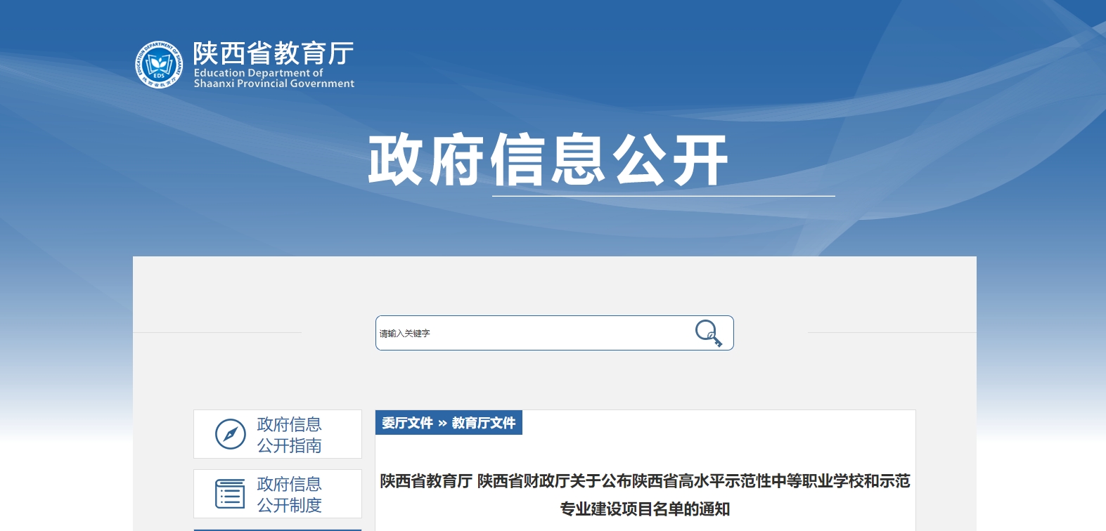 近日,陜西省教育廳、陜西省財(cái)政廳發(fā)布陜西省高水平示范性中等職業(yè)學(xué)校和示范專業(yè)建設(shè)項(xiàng)目名單的通知,將50所陜西省高水平示范性中等職業(yè)學(xué)校和150個示范專業(yè)建設(shè)項(xiàng)目(以下簡稱“雙示范”建設(shè)項(xiàng)目)名單予以公布。