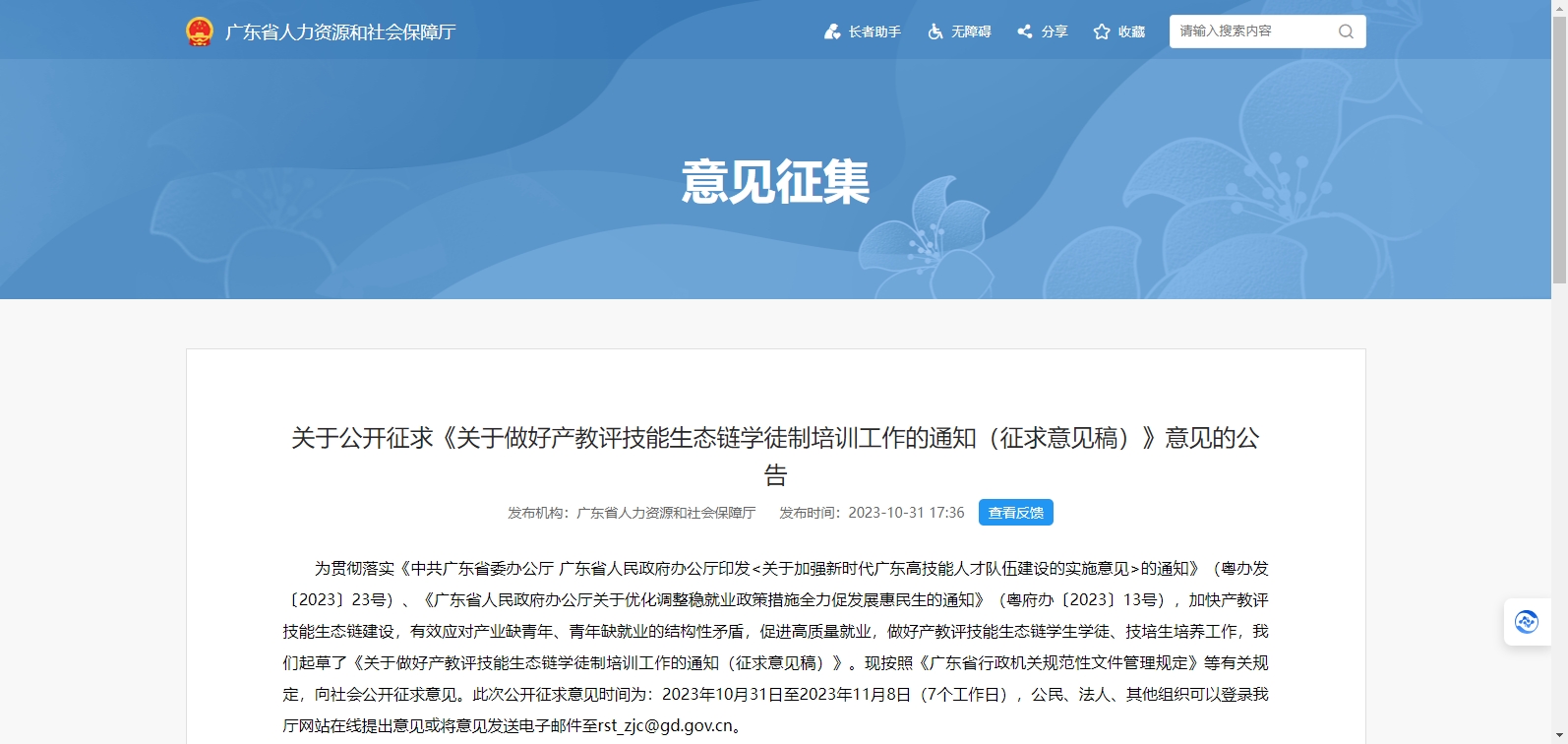 近日,廣東省人力資源和社會(huì)保障廳在其官網(wǎng)發(fā)布關(guān)于公開征求《關(guān)于做好產(chǎn)教評(píng)技能生態(tài)鏈學(xué)徒制培訓(xùn)工作的通知(征求意見稿)》意見的公告,按照《廣東省行政機(jī)關(guān)規(guī)范性文件管理規(guī)定》等有關(guān)規(guī)定,向社會(huì)公開征求意見。截止征求意見時(shí)間未收到有效反饋。