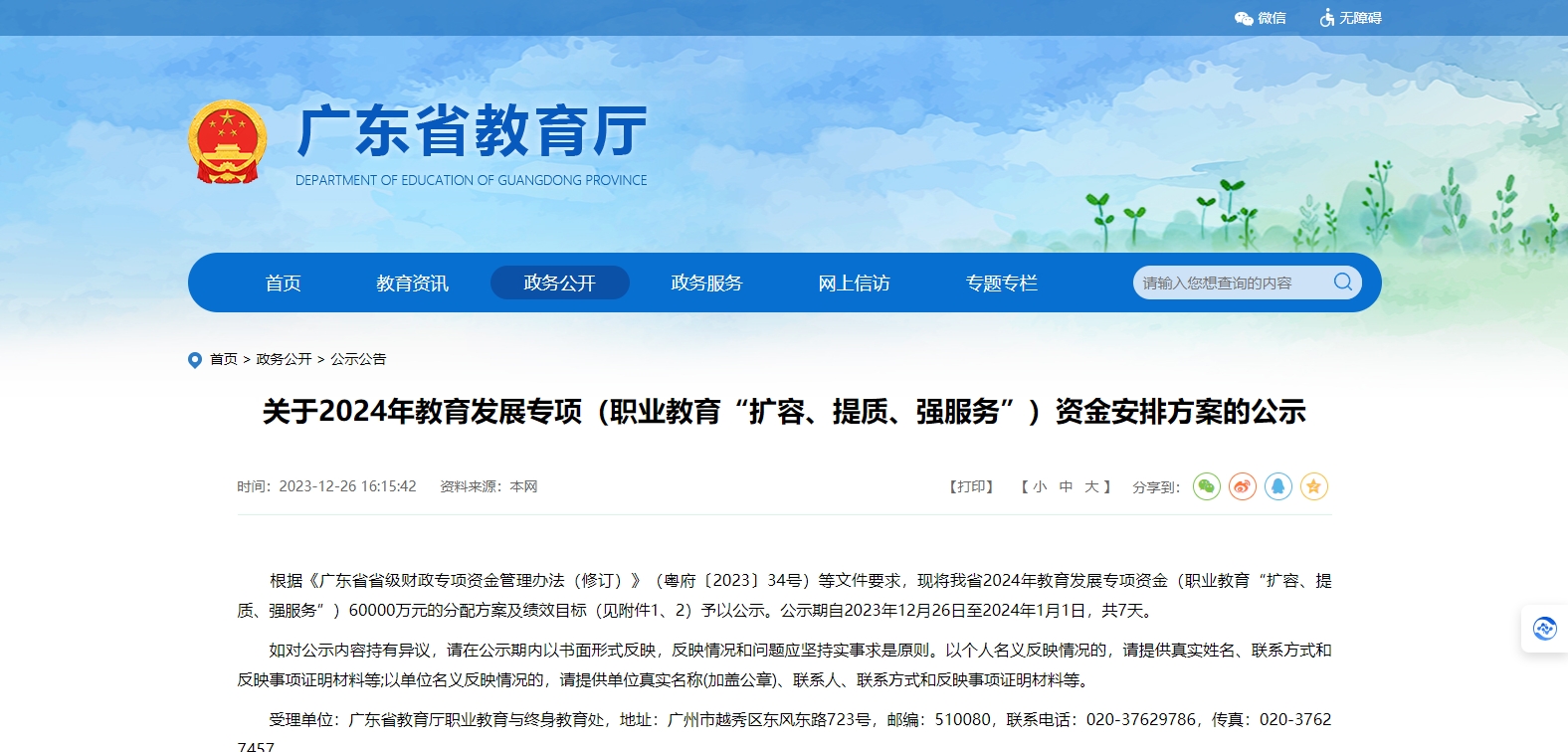 根據(jù)《廣東省省級(jí)財(cái)政專(zhuān)項(xiàng)資金管理辦法(修訂)》(粵府〔2023〕34號(hào))等文件要求,現(xiàn)將我省2024年教育發(fā)展專(zhuān)項(xiàng)資金(職業(yè)教育“擴(kuò)容、提質(zhì)、強(qiáng)服務(wù)”)60000萬(wàn)元的分配方案及績(jī)效目標(biāo)(見(jiàn)附件1、2)予以公示。公示期自2023年12月26日至2024年1月1日,共7天。