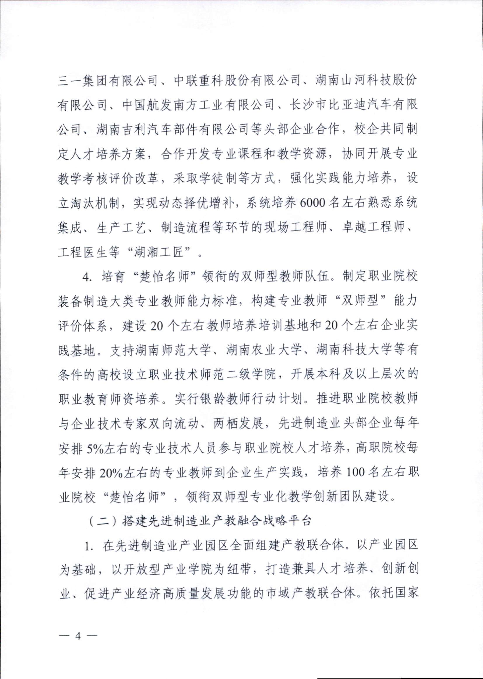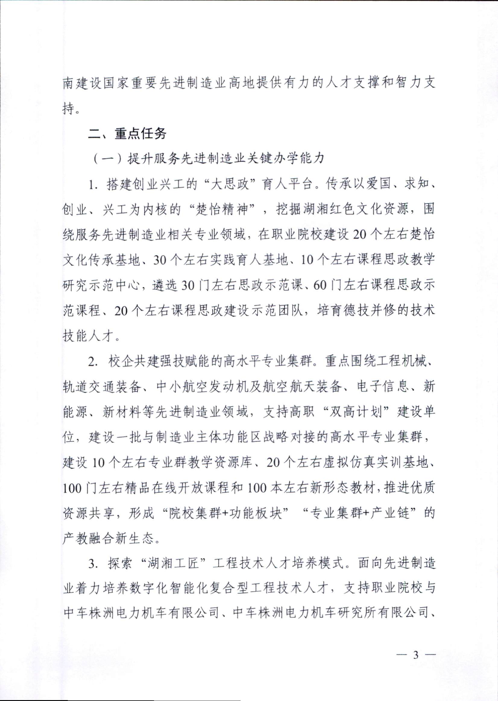 為深入學(xué)習(xí)貫徹黨的二十大精神,落實(shí)《關(guān)于深化現(xiàn)代職業(yè)教育體系建設(shè)改革的意見(jiàn)》,進(jìn)一步深化職業(yè)教育產(chǎn)教融合,助力國(guó)家重要先進(jìn)制造業(yè)高地建設(shè),依據(jù)《中華人民共和國(guó)職業(yè)教育法》,教育部和湖南省人民政府特制定本實(shí)施方案。其中重要任務(wù)中提及:2.校企共建強(qiáng)技賦能的高水平專業(yè)集群。重點(diǎn)圍繞工程機(jī)械、軌道交通裝備、中小航空發(fā)動(dòng)機(jī)及航空航天裝備、電子信息、新能源、新材料等先進(jìn)制造業(yè)領(lǐng)域,支持高職“雙高計(jì)劃”建設(shè)單位,建設(shè)一批與制造業(yè)主體功能區(qū)戰(zhàn)略對(duì)接的高水平專業(yè)集群,建設(shè)10個(gè)左右專業(yè)群教學(xué)資源庫(kù)、20個(gè)左右虛擬仿真實(shí)訓(xùn)基地、100門左右精品在線開(kāi)放課程和100本左右新形態(tài)教材,推進(jìn)優(yōu)質(zhì)資源共享,形成“院校集群+功能板塊”“專業(yè)集群+產(chǎn)業(yè)鏈”的產(chǎn)教融合新生態(tài)。