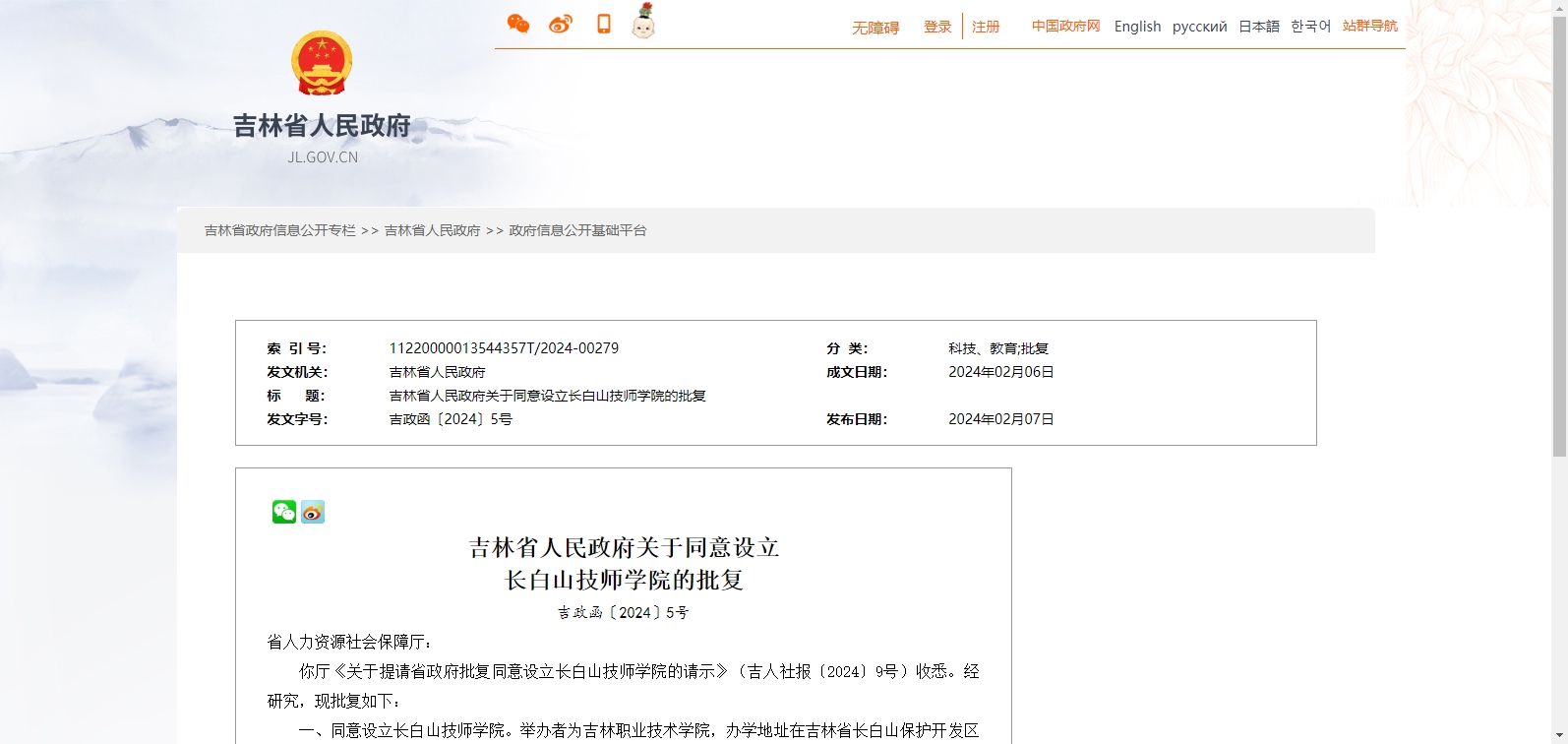 你廳《關(guān)于提請省政府批復(fù)同意設(shè)立長白山技師學院的請示》(吉人社報〔2024〕9號)收悉。經(jīng)研究,現(xiàn)批復(fù)如下: