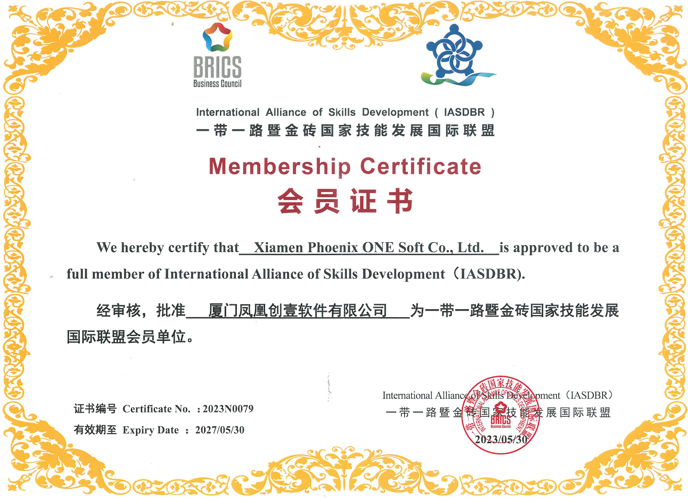 喜報!鳳凰創(chuàng)壹獲頒一帶一路暨金磚國家技能發(fā)展國際聯(lián)盟成員單位證書