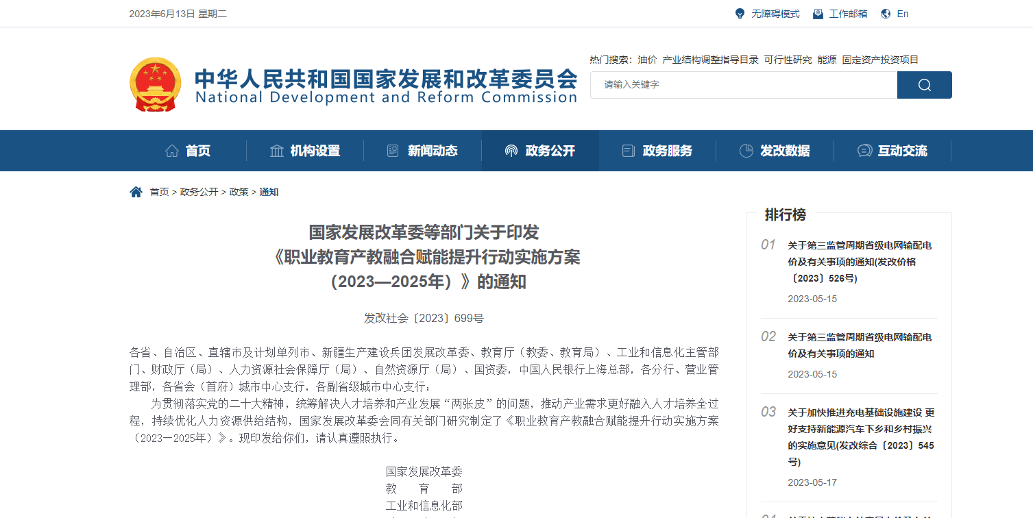 國家發(fā)展改革委等部門印發(fā) 《職業(yè)教育產(chǎn)教融合賦能提升行動實施方案 (2023—2025年)》的通知