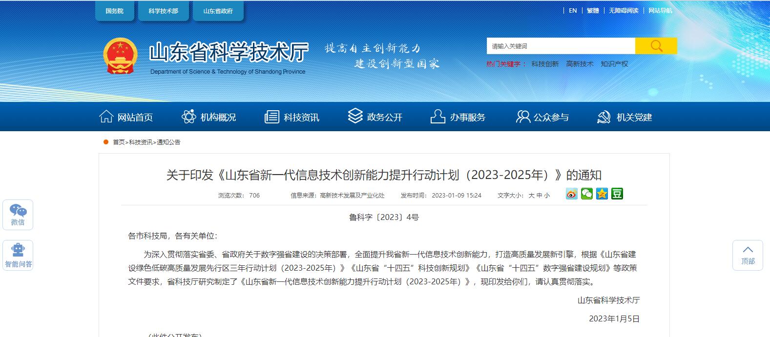 山東省印發(fā)《山東省新一代信息技術(shù)創(chuàng)新能力提升行動計劃(2023-2025年)》的通知