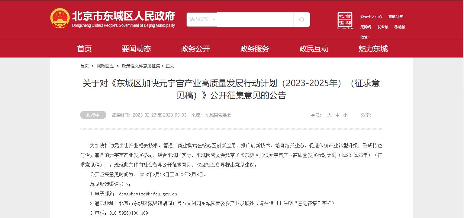 北京市東城區(qū)發(fā)布《東城區(qū)加快元宇宙產(chǎn)業(yè)高質(zhì)量發(fā)展行動計(jì)劃(2023-2025年)(征求意見稿)